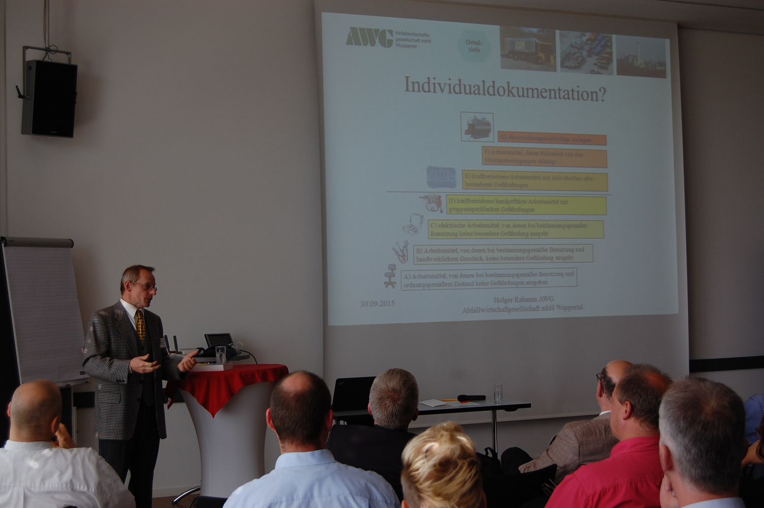 Dipl.-Ing. Holger Rabanus von der Abfallwirtschaftsgesellschaft Wuppertal mbH (AWG) zeigte die Herausforderungen der Betriebssicherheitsverordnung auf und stellte vielfältige Lösungswege zur Anlagensicherheit und zum betrieblichen Arbeitsschutz vor.