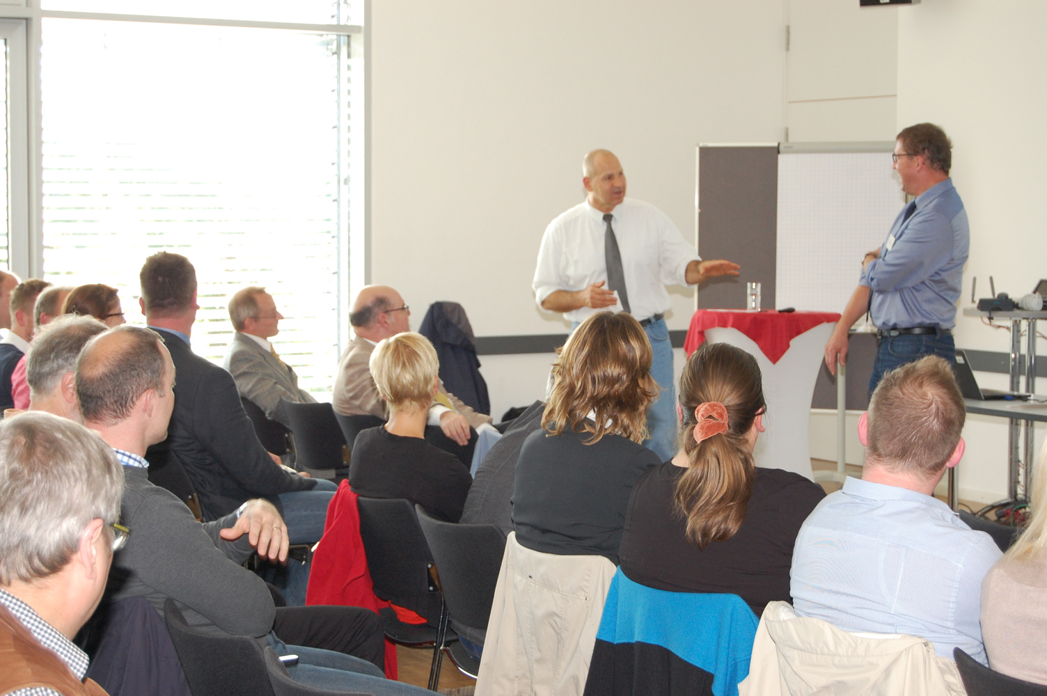 Dipl.-Ing. Karl-Heinz Lang vom Institut ASER e.V. (Wuppertal) und Dipl.-Ing. Klaus Nolting vom LIA.nrw (Düsseldorf) am 30. September 2015 bei der Abschlussdiskussion des 10. KomNet-Erfahrungsaustausches in Düsseldorf (v.l.n.r.).