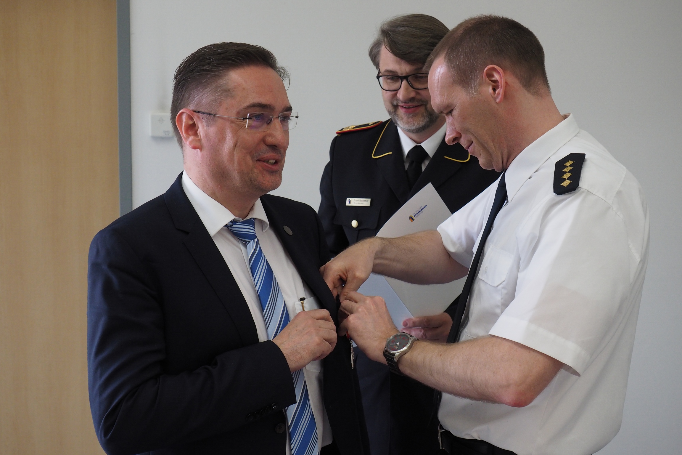 Prof. Goertz wurde das Deutsche Feuerwehr-Ehrenkreuz in Silber von Dr. Jan Heinisch (Vorsitzender des Verbandes der Feuerwehren in NRW) verliehen (v.l.n.r.). Foto: Michael Wolters
